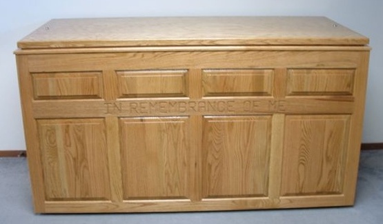 ARM’s communion-table baptistries are handcrafted of durable oak and are finished and stained by skilled craftsmen. Each unit contains a molded fiberglass tank with a seat that holds 150 gallons of water that can be filled and drained with a garden hose.