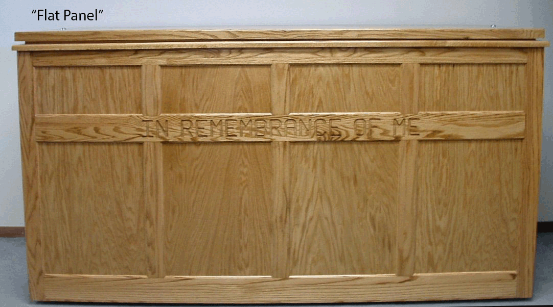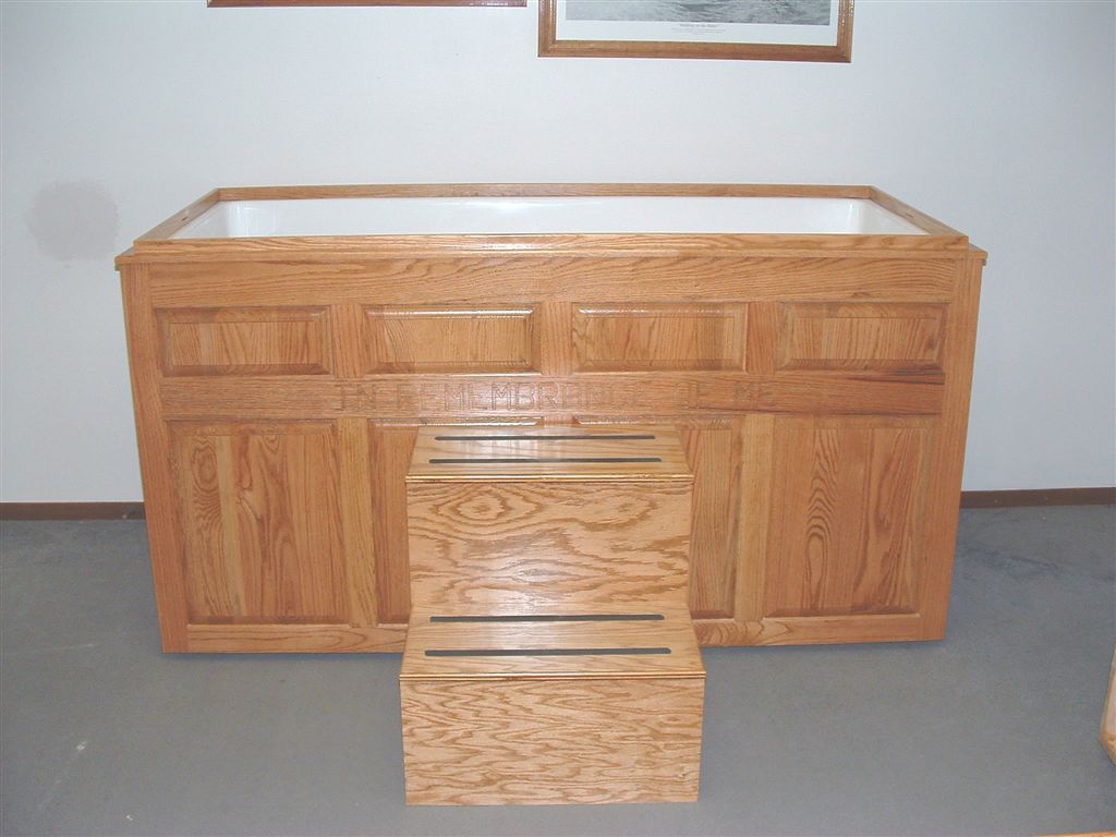 Three styles are available ‒ the original, the flat panel and the raised panel ‒ as well as a separate fiberglass tub with no cabinet. A number of additional options are available including a factory-installed heater, steps designed to be stored inside the baptistry, factory-installed casters for ease of movement, and a table-top lectern stained to match the baptistry.